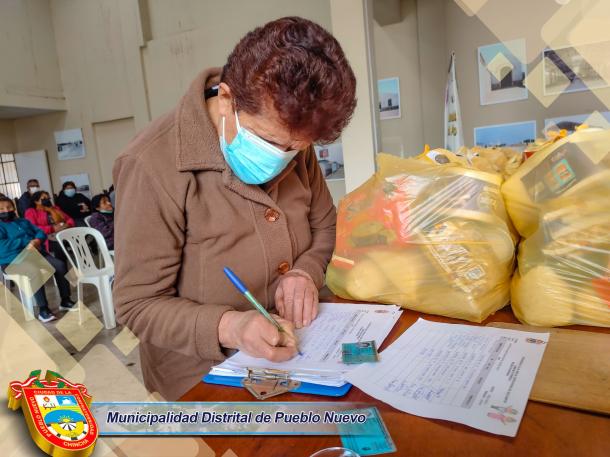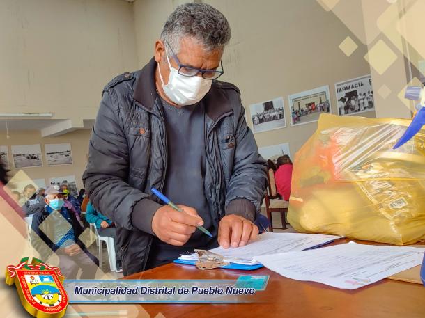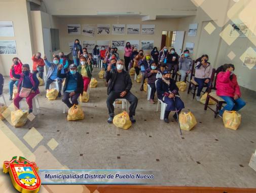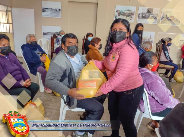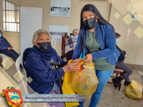 La municipalidad distrital de Pueblo Nuevo, a través de la Sub Gerencia de Desarrollo Social, realizo la entrega de bolsas de víveres de primera necesidad a los adultos mayores del programa nacional Pensión 65 de nuestra localidad.