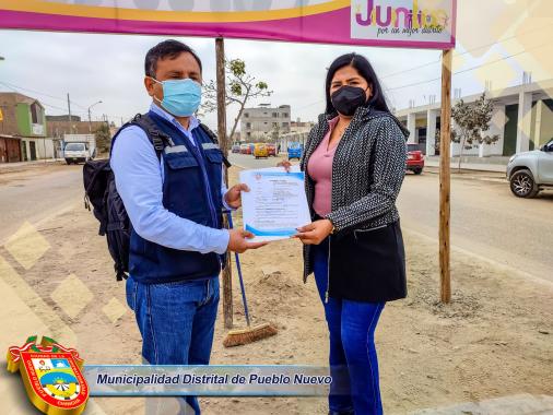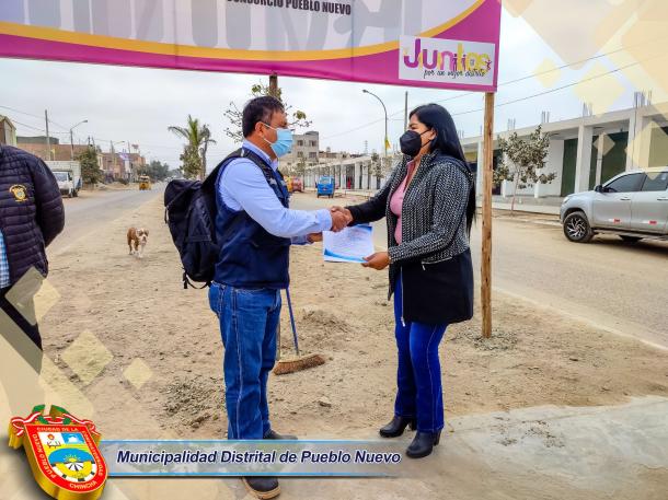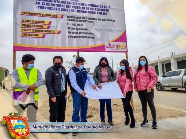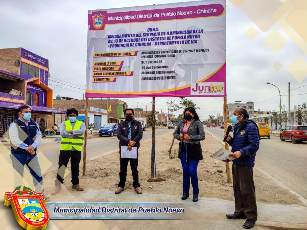 La Municipalidad Distrital de Pueblo Nuevo, como parte de su plan de acciones para mejorar la calidad de vida de los moradores del distrito, oficializó la entrega de terreno para el desarrollo de la obra “MEJORAMIENTO DEL SERVICIO DE ILUMINACIÓN DE LA AV. 13 DE OCTUBRE”.