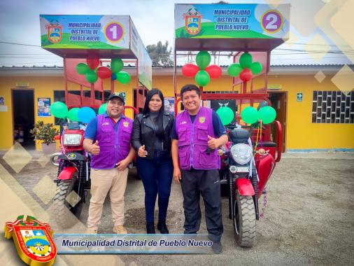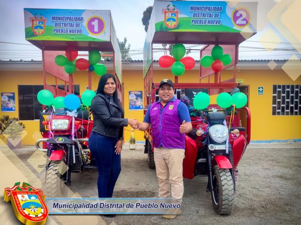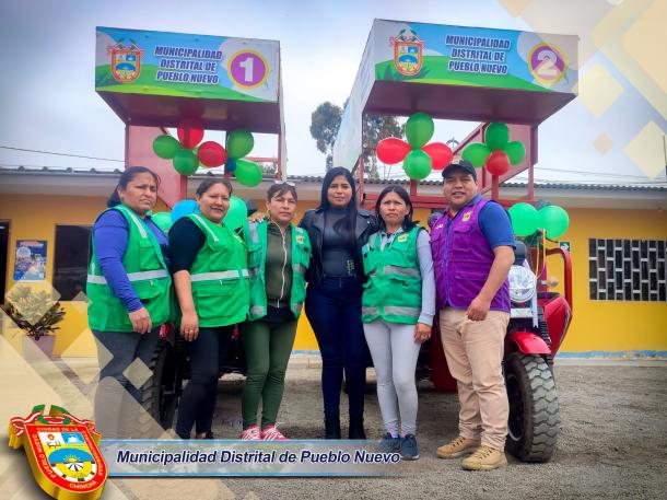 En una breve ceremonia donde participaron la Alcaldesa BERTHA PEÑA ORMEÑO, el Coordinador del Programa de Incentivos Prof. Juan Carlos Pachas Castilla, el responsable del Programa de Segregación en la Fuente Ing. Ángel Merino Carhuapoma e integrantes del programa; donde se presentó 2 nuevas motocargas para una capacidad de carga de 1 tonelada.