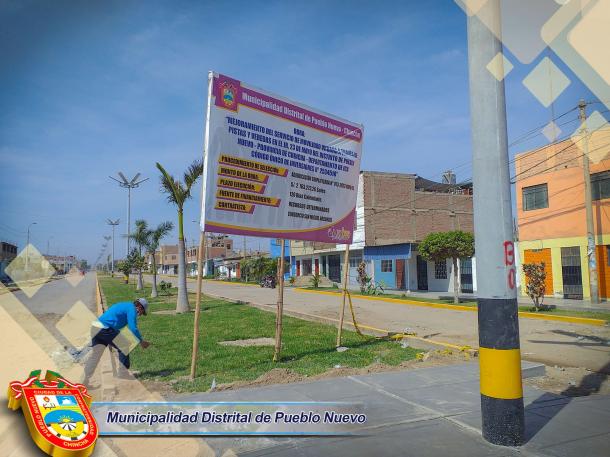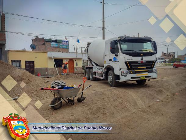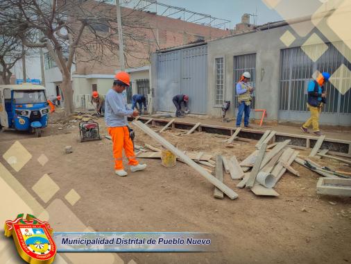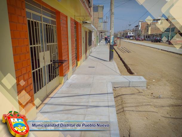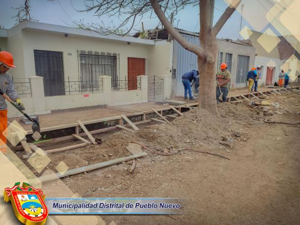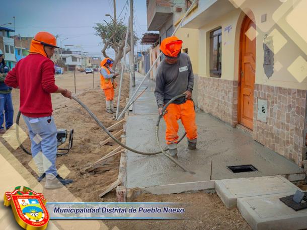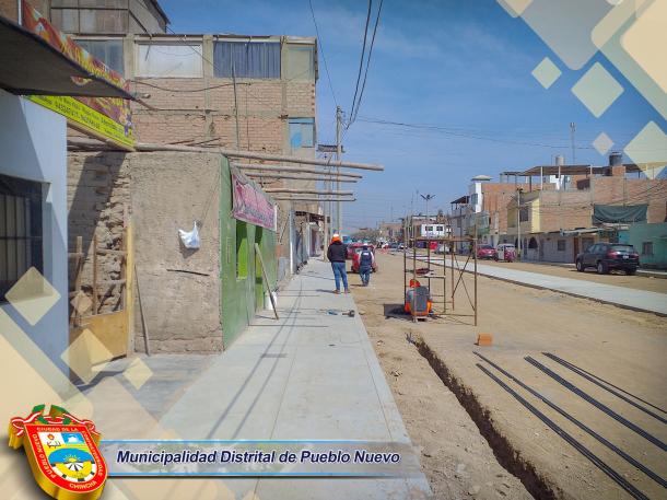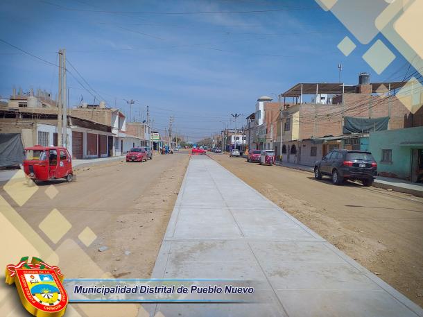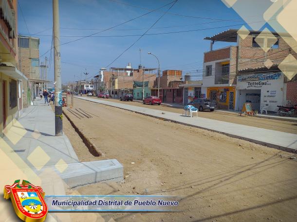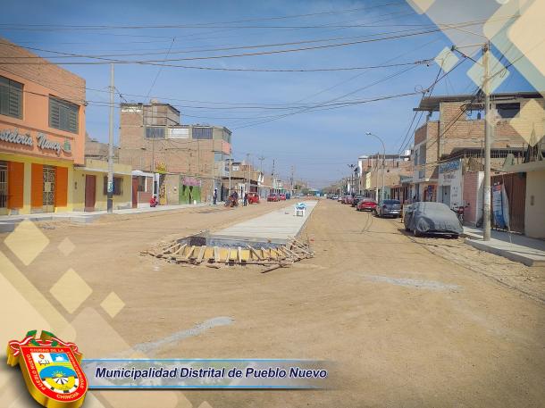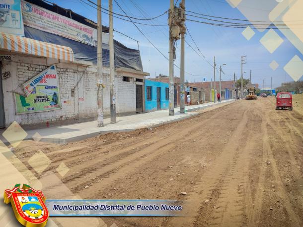 La Municipalidad Distrital de Pueblo Nuevo, viene ejecutando la obra de "MEJORAMIENTO DEL SERVICIO DE MOVILIDAD URBANA A TRAVES DE PISTAS Y VEREDAS EN JR. 23 DE MAYO", con un avance de más de 37% en ejecución, donde se viene realizando la construcción de las veredas y berma central, compactación y afirmado de la tierra, para posterior realizar el asfaltado en caliente, beneficiando a todas las familias de la mencionada calle y del cercado del distrito.