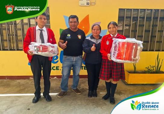 El alcalde del distrito de Pueblo Nuevo, Ing. William Sánchez Cahuana, sigue demostrando su compromiso con la educación al entregar instrumentos musicales a la banda de música de la institución educativa "Fe y Alegría".